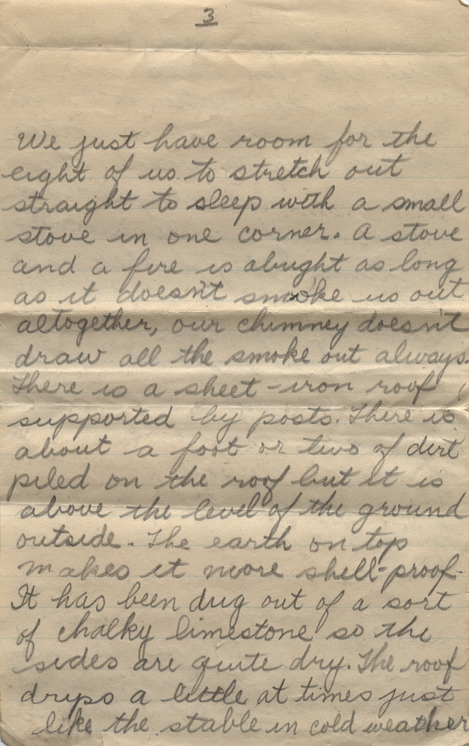 We just have room for the eight of us to stretch out straight to sleep with a small stove in one corner. A stove and a fire is alright as long as it doesn't smoke us out altogether, our chimney doesn't draw all the smoke out always. There is a sheet-iron roof supported by posts. There is about a foot or two of dirt piled on the roof but it is above the level of the ground outside. The earth on top makes it more shell-proof. It has been dug out of a sort of chalky limestone so the sides are quite dry. The roof drips a little at times just like the stable in cold weather.