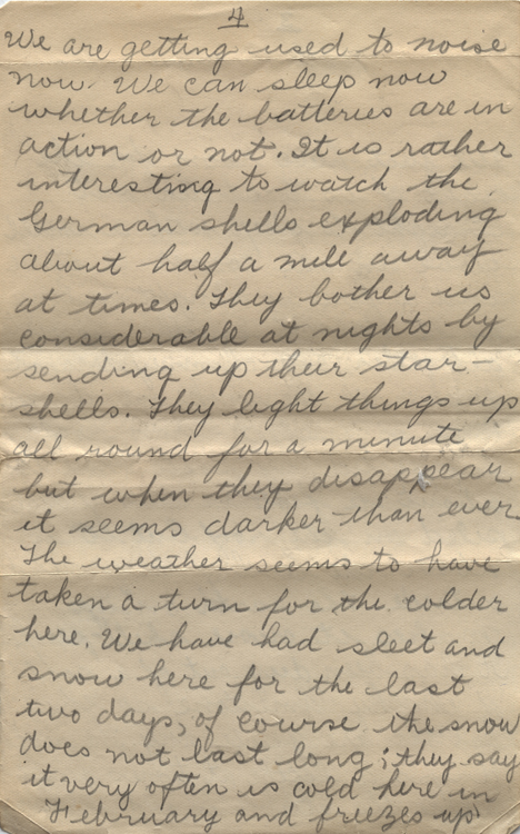 We are getting used to noise now. We can sleep now whether the batteries are in action or not. It is rather interesting to watch the German shells exploding about half a mile away at times. They bother us considerable at nights by sending up their star-shells. They light things up all round for a minute but when they disappear it seems darker than ever. The weather seems to have taken a turn for the colder here. We have had sleet and snow here for the last two days, of course the snow does not last long; they say it very often is cold here in February and freezes up.