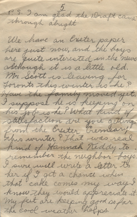 We have an Exeter paper here just now, and the boys are quite interested in the news although it is a little old. Mr Scott is leaving for Toronto this winter is he? Have the family moved yet, I suppose he is keeping on his job is he? What kind of satisfaction are you getting from the Exeter Cremeary this winter? That was real kind of Hannah Keddy to remember the neighbor boys. I sure will write a letter to her if I get a chance when that cake comes my way. I know they would appreciate it. My feet are keeping good so far the cool weather helps.
