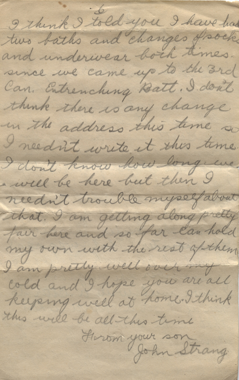I think I told you I have had two baths and changes of socks and underwear both times since we came up to the 3rd Can. Entrenching Batt. I don't think there is any change in the address this time so I needn't write it this time. I don't know how long we will be here but then I needn't trouble myself about that. I am getting along pretty fair here and so far can hold my own with the rest of them. I am pretty well over my cold and I hope you are all keeping well at home. I think this will be all this time
