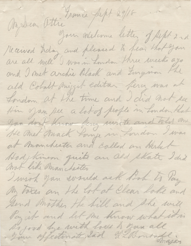 Your welcome letter of Sept 2nd received today and pleased to hear that you are all well I was in London three weeks ago and I met Archie Black and Fergison the old Cobalt Nugget editor Percy was at London at the time and I did not see him you see a lot of people in London that you don’t know Percy wrote and told me he met Mack [?] in London I was at Manchester and called on Hodgkinson quite an old skate I did not like Manchester.