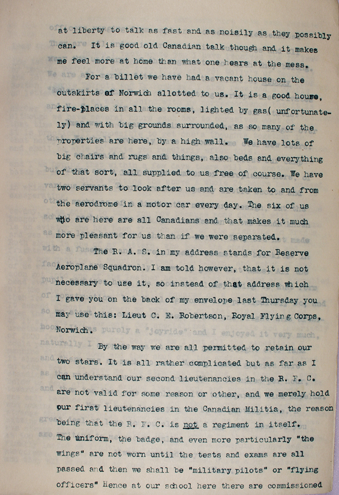 The R. A. S. in my address stands for Reserve Aeroplane Squadron. I am told however, that it is not necessary to use it, so instead of that address which I gave you on the back of my envelope last Thursday you may use this: Lieut C. E. Robertson, Royal Flying Corps, Norwich.