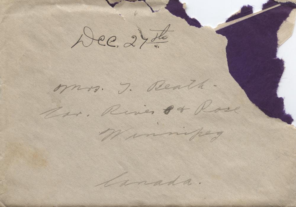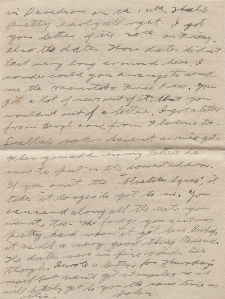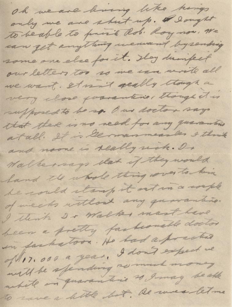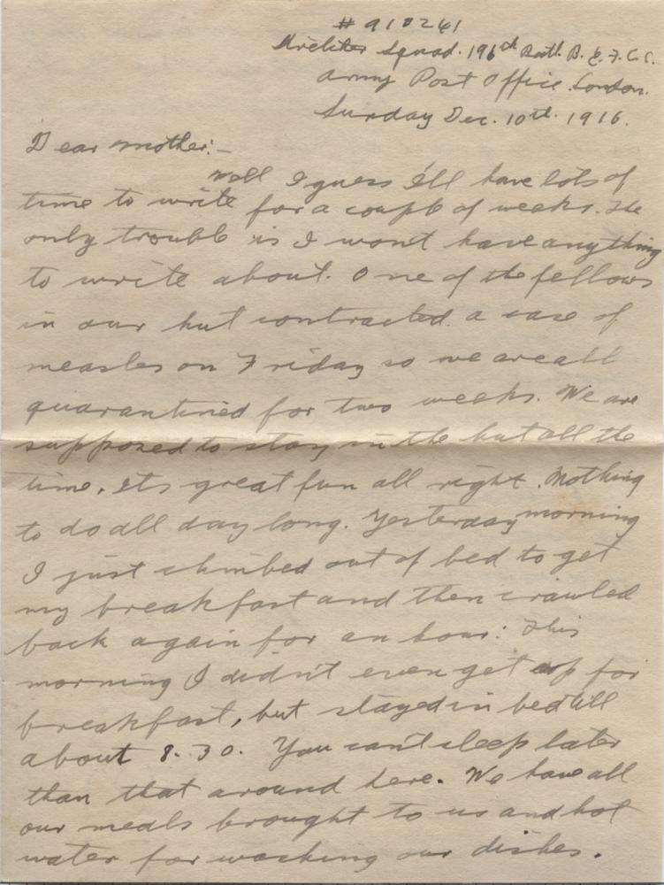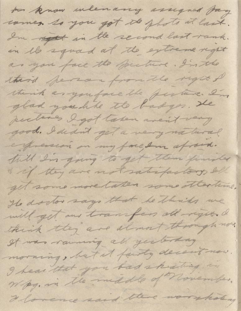 Well I guess I’ll have lots of time to write for a couple of weeks. The only trouble is I won’t have anything to write about. One of the fellows in out hut contracted a case of measles on Friday so we are all quarantined for two weeks. We are supposed to stay in the hut all the time. Its great fun all right. Nothing to do all day long. Yesterday morning I just climbed out of bed to get my breakfast and then crawled back again for an hour. This morning I didn’t even get up for breakfast, but stayed in bed till about 8.30. You can’t sleep later than that around here. We have all our meals brought to us and hot water for washing our dishes. Oh we are living like kings only we are shut up. I ought to be able to finish Rob Roy now. We can get anything we want by sending some one else for it. They disinfect our letters too so we can write all we want. It isn’t really though a very close quarantine, though it is supposed to be so. Out doctor says that there is no need for any quarantine at all. It is German measles I think and no one is really sick. Dr. Walker says that if they would hand the whole thing over to him he could stamp it out in a couple of weeks without any quarantine. I think Dr. Walker must have been a pretty fashionable doctor in Saskatoon. He has a practice of $17, 000 a year. I don’t expect we will be spending so much money while in quarantine so I may be able to save a little bit. Be sure to let me know when any assigned pay comes. So you got the shots at last. I’m in the second last row in the squad at the extreme right as you face the picture. I’m the third person from the right I think as you face the picture. I’m glad you like the badges. The pictures I got taken aren’t very good. I didn’t get a very natural expression on my face I’m afraid. Still I’m going to get them finished & if they are not satisfactory I’ll get some more taken some other time. The doctor says that he thinks we will get our transfers all right. I think they are almost through now. It was raining all yesterday morning, but it fairly decent now. I hear that you had skating in Wpg. in the middle of November. Florence said there was skating in Davidson on the 12th. That’s pretty early all right. I got your letter of the 20th on Friday. also the dates. Those dates didn’t last very long around here. I wonder could you arrange to send me the Manitoba Free Press. You get a lot of news out of it that wouldn’t out of a letter. I got a letter from Beryl & one from Florence too. Luella’s socks haven’t arrived yet. When you address my letter be sure to put on the correct address. If you omit the “Stretcher Squad”, it takes it longer to get to me. You can send along all the eats you want, too. The fudge you sent was pretty hard when it got here. Perhaps it isn’t a very good thing to send. The dates were in fine condition though. I wrote a letter for Thursday’s mail but didn’t get it mailed so it will likely get to you the same time as this.