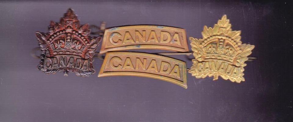 Maple Leaf cap badges and Canada shoulder titles from Gladys' "Box of Treasures."