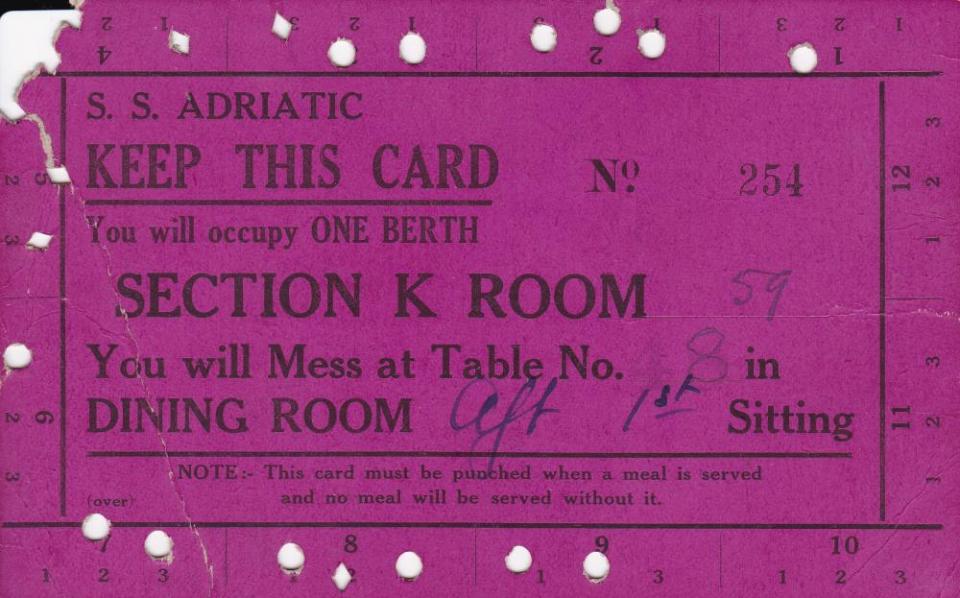 SS Adriatic Meal and Room Card- Charles Hornibrook embarked on the SS Adriatic on April 12th, 1919.