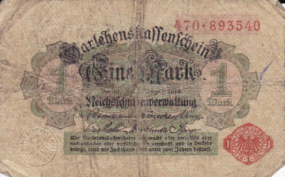 One Mark banknote sent by Charles to his niece Gladys Hornibrook, enclosed with letter dated January 12th, 1919.