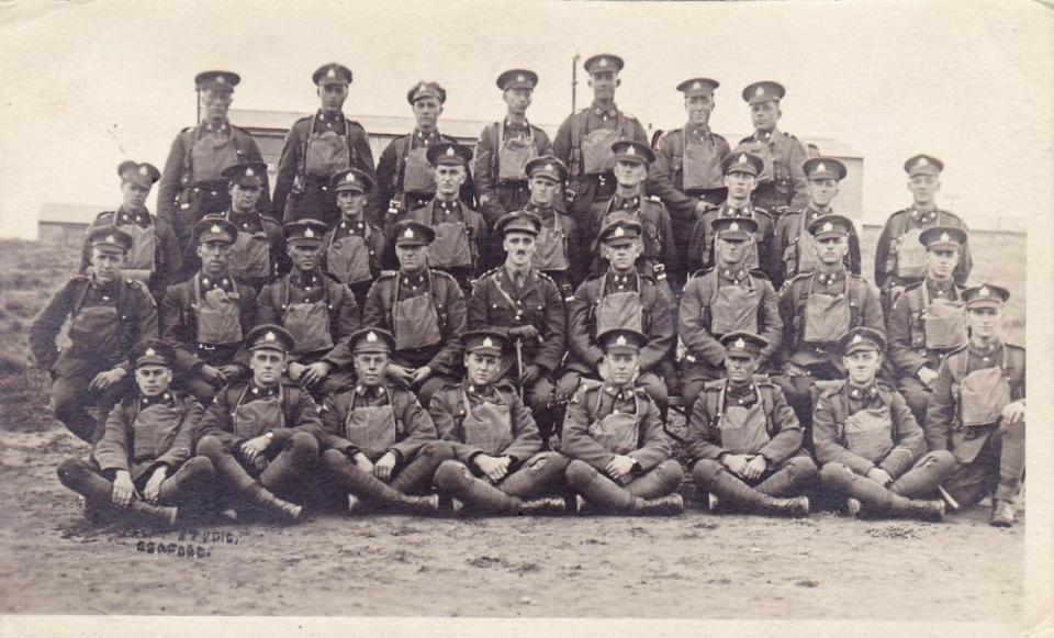 [Charles Hornibrook at top-left with Cyclist Platoon, England. Sent by Charles to his neice Gladys Hornibrook, enclosed with letter, date unknown]