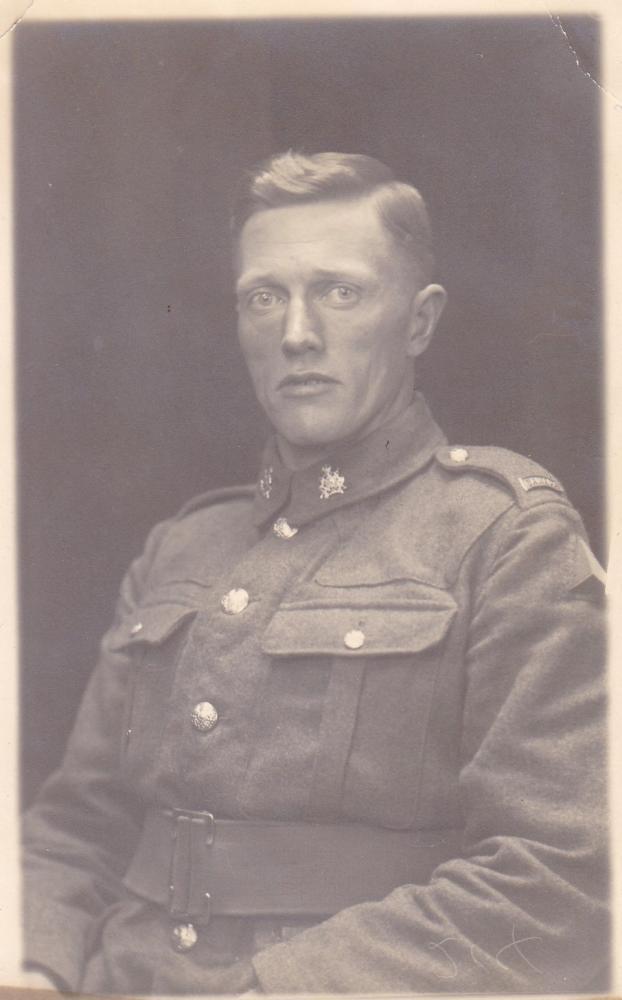 Charles Hornibrook with cyclist collar dogs & shoulder flash. Sent by Charles to his niece Gladys Hornibrook, enclosed with letter dated September 9th, 1918