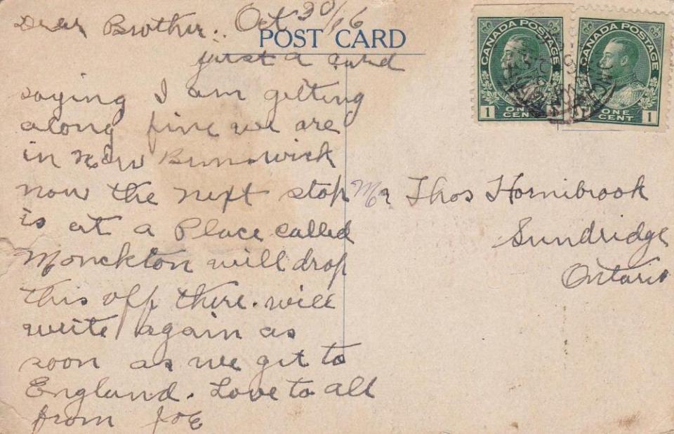 [Postcard sent by Gladys' uncle Pte. Joseph Hornibrook to his brother Thomas, October 30th, 1916, back]