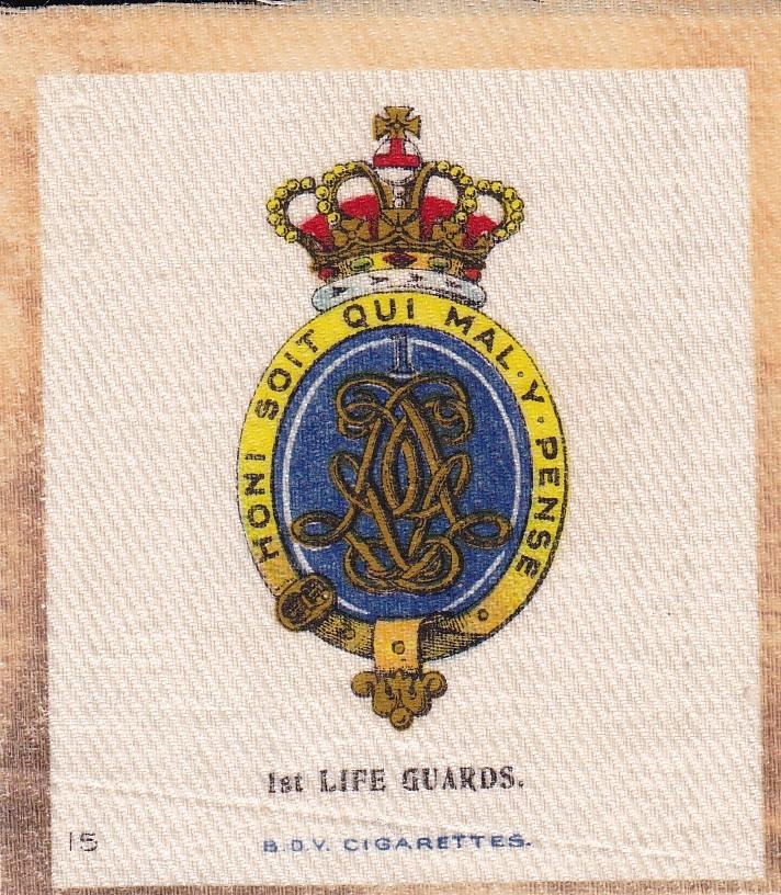 Silk card of emblem from a BDV cigarette pack sent by Charles to his neice Gladys Hornibrook, enclosed with letter dated August 28th, 1918.