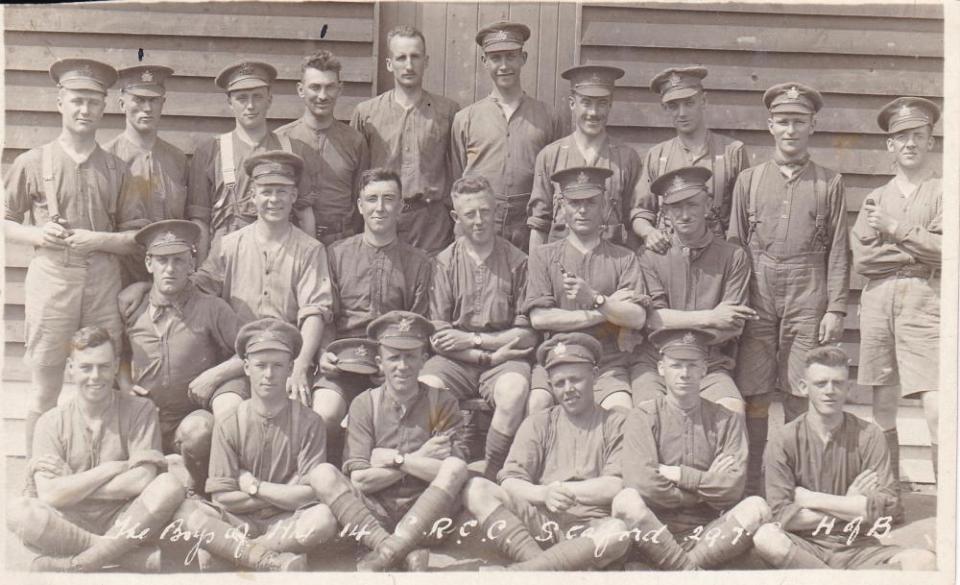 Uncle Pte. Charles Hornibrook (back row, 2nd from left) and John Dobbs (back row, 4th from left) with Cyclist Platoon in Seaford, England. Taken July 29th, 1918. Enclosed with letter sent to Gladys Hornibrook, dated August 4th, 1918.