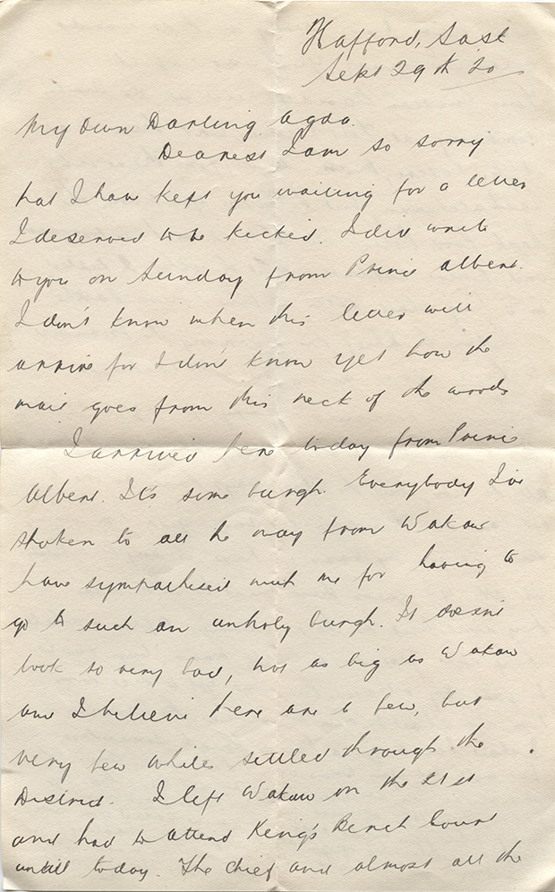Dearest I am so sorry that I have kept you waiting for a letter I deserved to be kicked. I did write to you on Sunday from Prince Albert I don’t know when this letter will arrive for I don’t know yet how the mail goes from this neck of the woods.