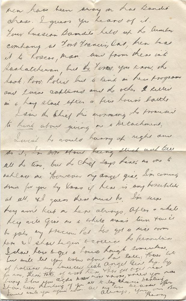I saw the Chief this morning, he promised to think about giving me a Detachment. I wish he would hurry up right and do it, I’m sure of our being stuck with Bill all the time, but the Chief says there’s no one to replace me. However my angel girl, I’m coming down for you by Xmas if there is any possibility at all, and I guess there must be. I’m sure they ain’t keep me here always, After a while they will give me a white man’s town and we’ll be jake my precious Pet. I’ve got a nice room here and I shall begin to collect the furniture. I shall have to get a house bought somewhere, but will let you know about that later. Have lot of patience my Sweetest little Angel Girl. Bye-bye for now, There’s TONS of work here, and I’ve got to get [?]. I love you Agda Dear more and more, and need you more I have been thinking of you all today Cheerio Darling I will write you again soon. All my love Dearest