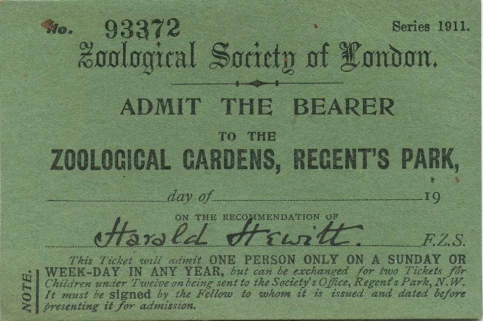 Ticket to the Zoological Society of London, from the wallet of Herbert Boggs, date unknown.