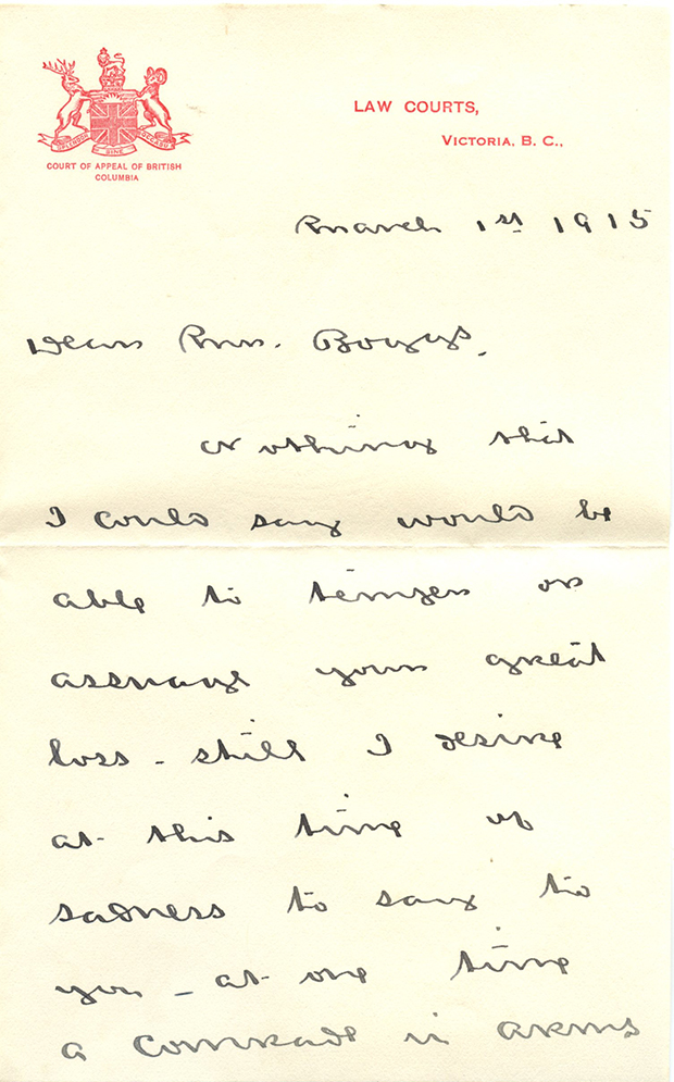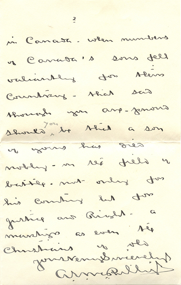 Nothing that I could say would be able to temper or assuage your great loss- still I desire at this time of sadness to say to you- at one time a comrade in arms in Canada- when numbers of Canada’s sons fell valiantly for this Country- that sad though you are- proud should you be that a son of yours has died nobly- on the field in battle. not only for his country but for Justice and Right- a martyr as even the Christians of old