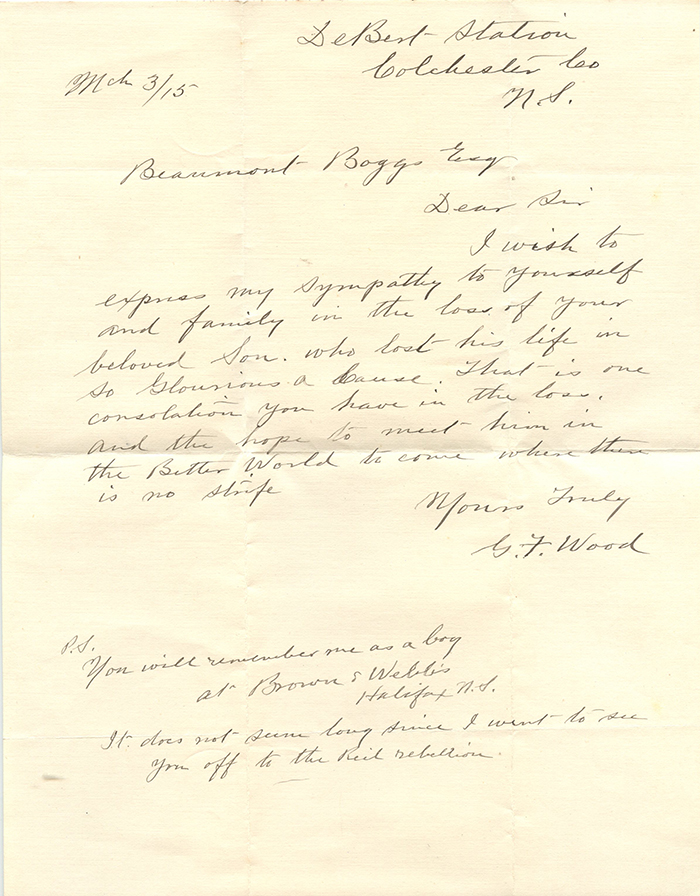 P.S. You will remember me as a boy at Brown and Webb’s Halifax N.S. It does not seem long since I went to see you off to the Riel rebellion.