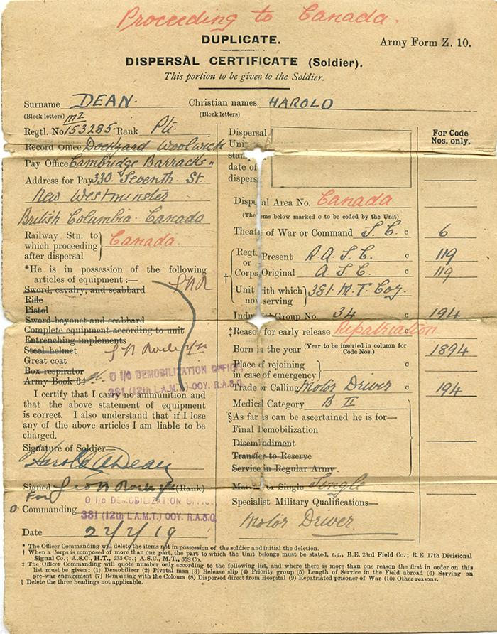Dean, Harold Adelbert Personal Item: 1919 February 22nd