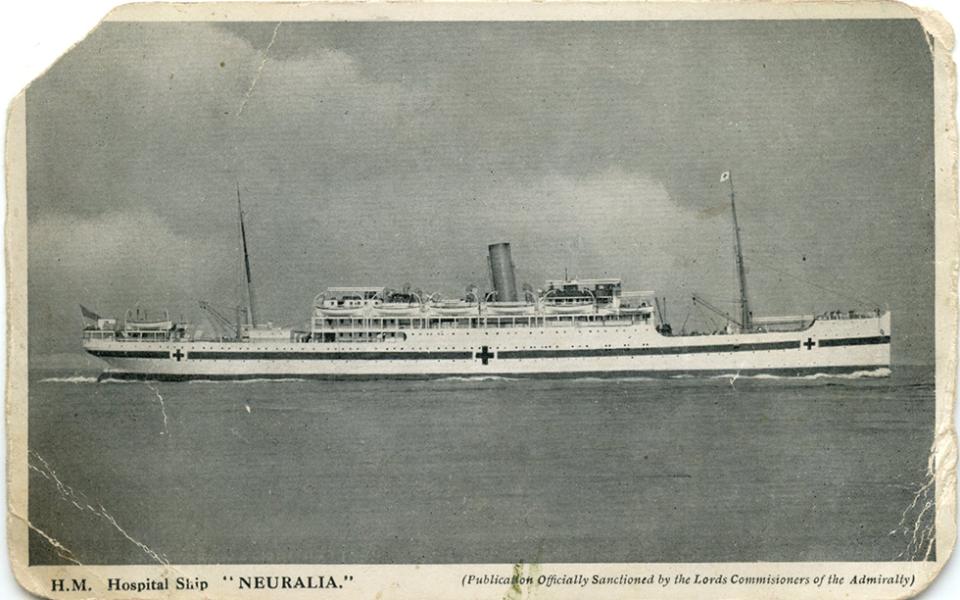 [Postcard, date unknown, front.] H.M Hospital Ship "NEURALIA" "This is the boat we came from Durban to Cape Town on I am now in No 2 General Hospital, Maitland about two miles from Cape Town."