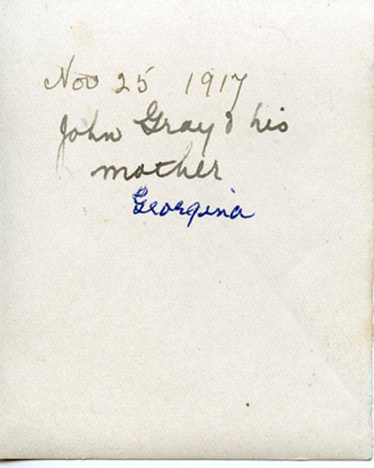 John Gray with his Mother Georgina, November 25th, 1917, back.