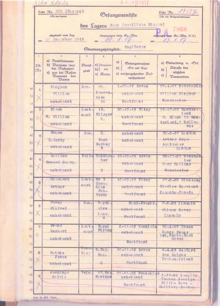 “Gefangenenlifte des Lagers.” Record of Arthur Copeland on the prisoner list of the P.O.W. camp at Wahn (western base), January 1917.