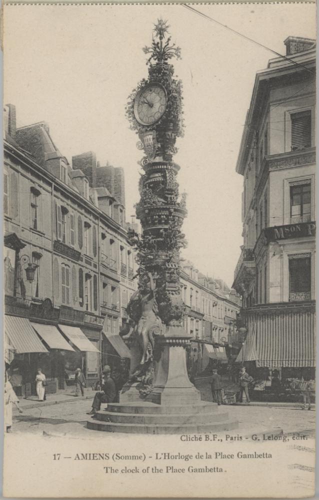 Album #3, Card # 14, front view, depicting the Place Gambetta clock in Amiens, Somme, France.