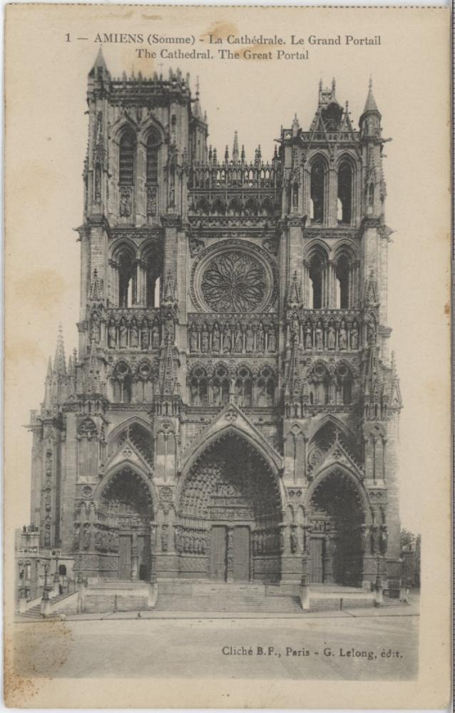 Postcard #25, front view, depicting the Great Portal of the Cathedral at Amiens, Somme, France.