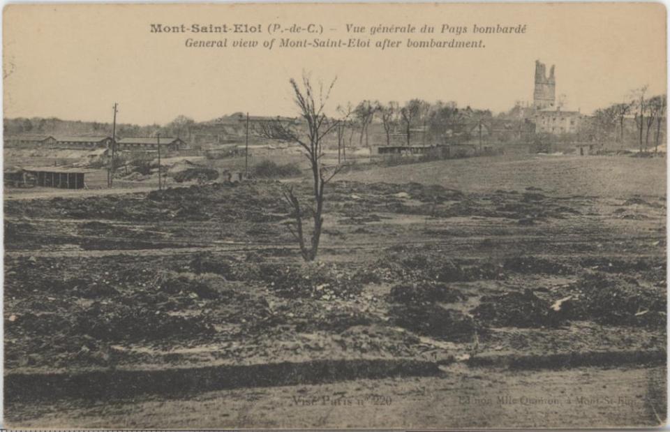 Postcard #29, front view, depicting shell damage in Mont Saint-Eloi, Pas-de-Calais, France.