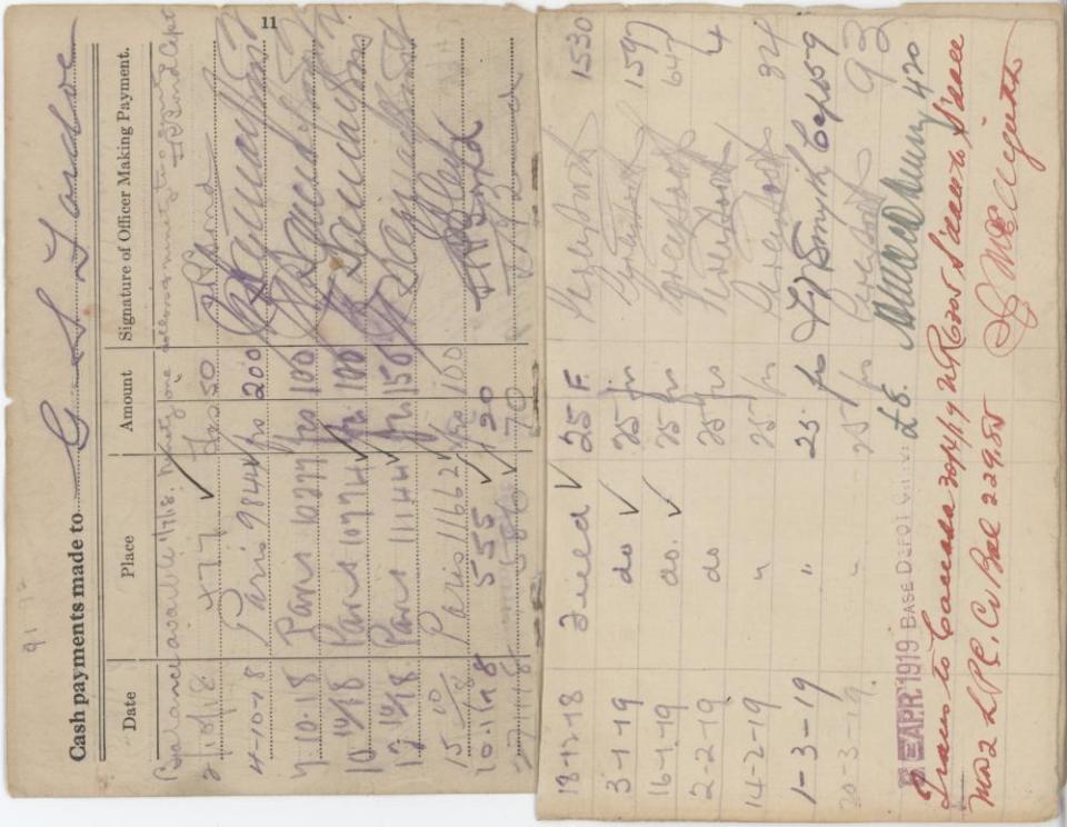 Army Pay Book of 1917-1919, pgs. 11 with supplemental page (added on right)
