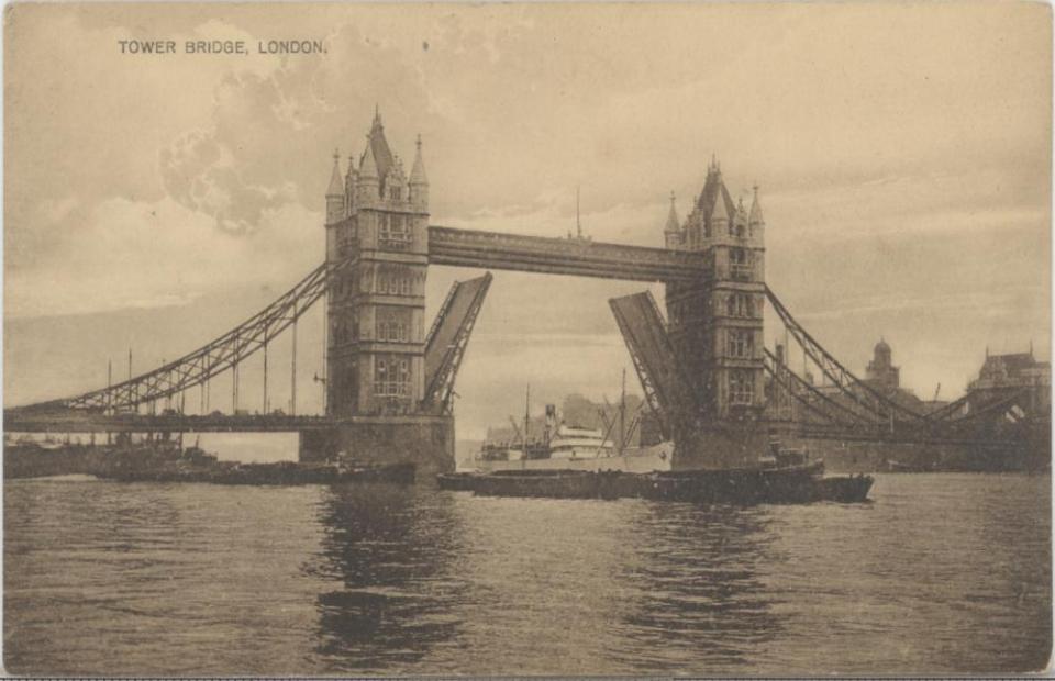 Postcard of May 5, year unknown, front view, captioned "TOWER BRIDGE, LONDON."
