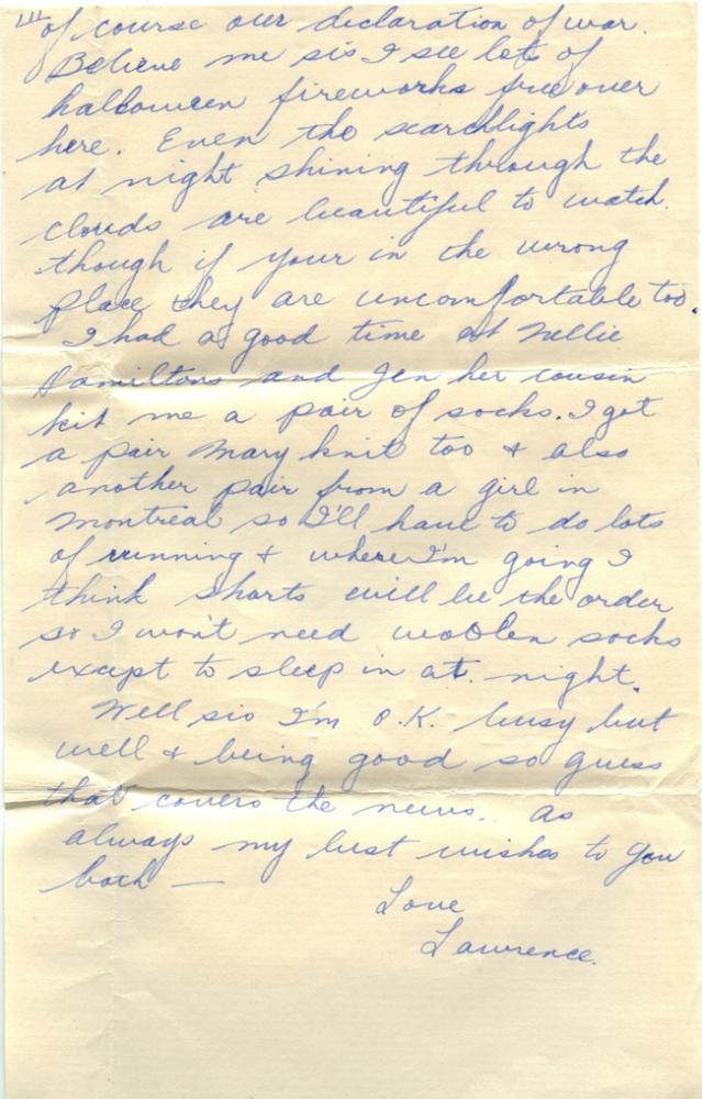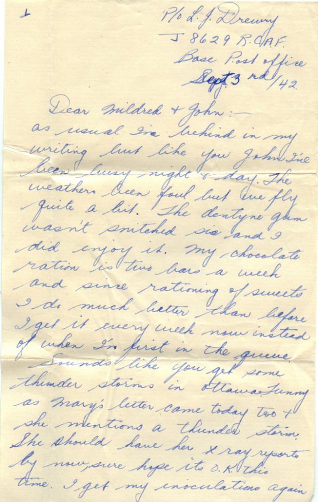 As usual I’m behind in my writing but like you John I’ve been busy night and day. The weathers been foul but we fly quite a bit. The dentyne gum wasn’t snitched sis and I did enjoy it. My chocolate ration is two bars a week and since rationing of sweets I do much better than before I get it every week now instead of when I’m first in the queue.