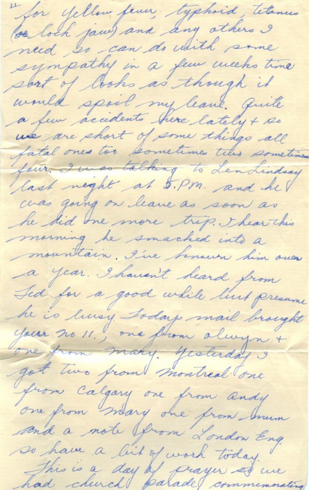 Sounds like you get some thunder storms in ottawa. Funny as Mary’s letter came today too and she mentions a thunder storm. She should have her xray reports by now, sure hope its O.K. this time. I get my inoculations again for yellow fever, typhoid, tetanus (lock jaw) and any others I need so can do with some sympathy in a few weeks time sort of looks as though it would spoil my leave. Quite a few accidents here lately and so we are short of some things all fatal ones too sometimes two sometimes four. I was talking to Len Lindsay last night at 5.P.M. and he was going on leave as soon as he did one more trip. I hear this morning he smacked into a mountain. I’ve known him over a year. I haven’t heard from Ted for a good while but presume he is busy. Todays mail brought your No 11., one from Alwyn and one from Mary. Yesterday I got two from Montreal one from Calgary one from Andy one from Mary one from mum and a note from London Eng. so have a bit of work today.