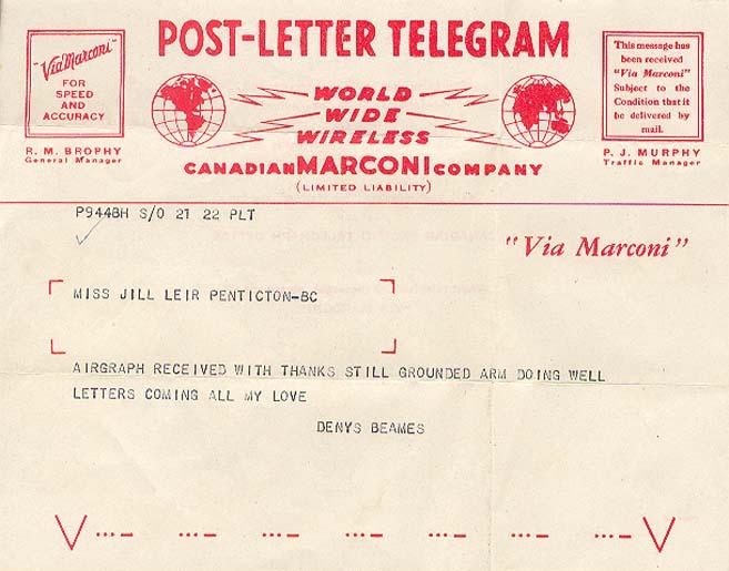 AIRGRAPH RECEIVED WITH THANKS STILL GROUNDED ARM DOING WELL LETTERS COMING ALL MY LOVE