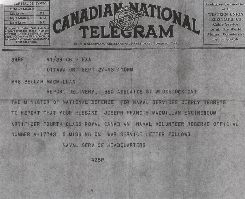 THE MINISTER OF NATIONAL DEFENSE FOR NAVAL SERVICES DEEPLY REGRETS TO REPORT THAT YOUR HUSBAND JOSEPH FRANCIS MACMILLAN ENGINEROOM ARTIFICER FOURTH CLASS ROYAL CANADIAN NAVAL VOLUNTEER RESERVE OFFICIAL NUMBER V-17743 IS MISSING ON WAR SERVICE LETTER FOLLOWS