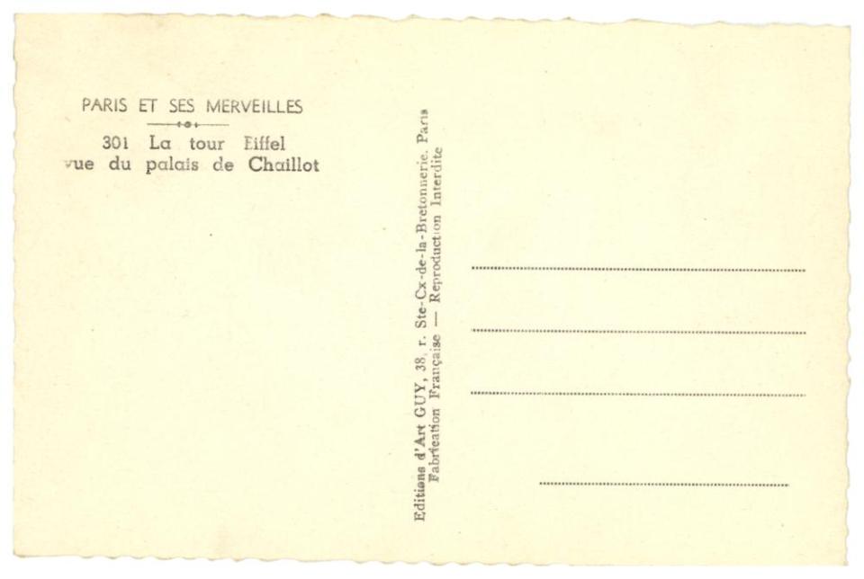 #22-back: Printed “PARIS ET SES MERVEILLES. 301 La tour Eiffel vue du palais de Chaillot.”