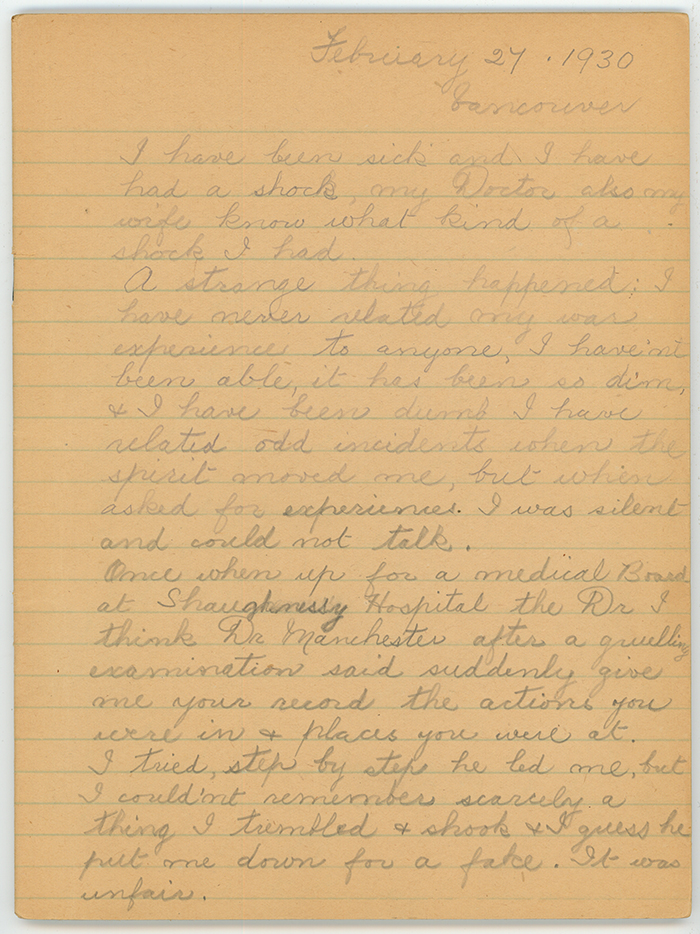 Once when up for a medical Board at Shaughnessy Hospital the Dr. I think Dr. Manchester after a gruelling examination said suddenly give me your record the actions you were in and places you were at. I tried, step by step he led me, but I could'nt remember scarcely a thing I trembled and shook and I guess he put me down for a fake. It was unfair.
