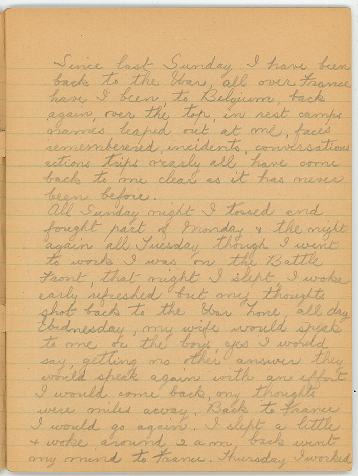 Since last Sunday I have been back to the War, all over France have I been, to Belgium, back again, over the top in rest camps names leaped out at me, faces remembered, incidents, conversations actions trips nearly all have come back to me clear as it has never been before.