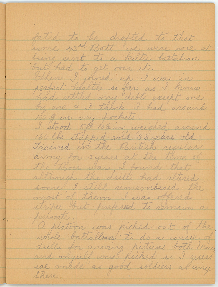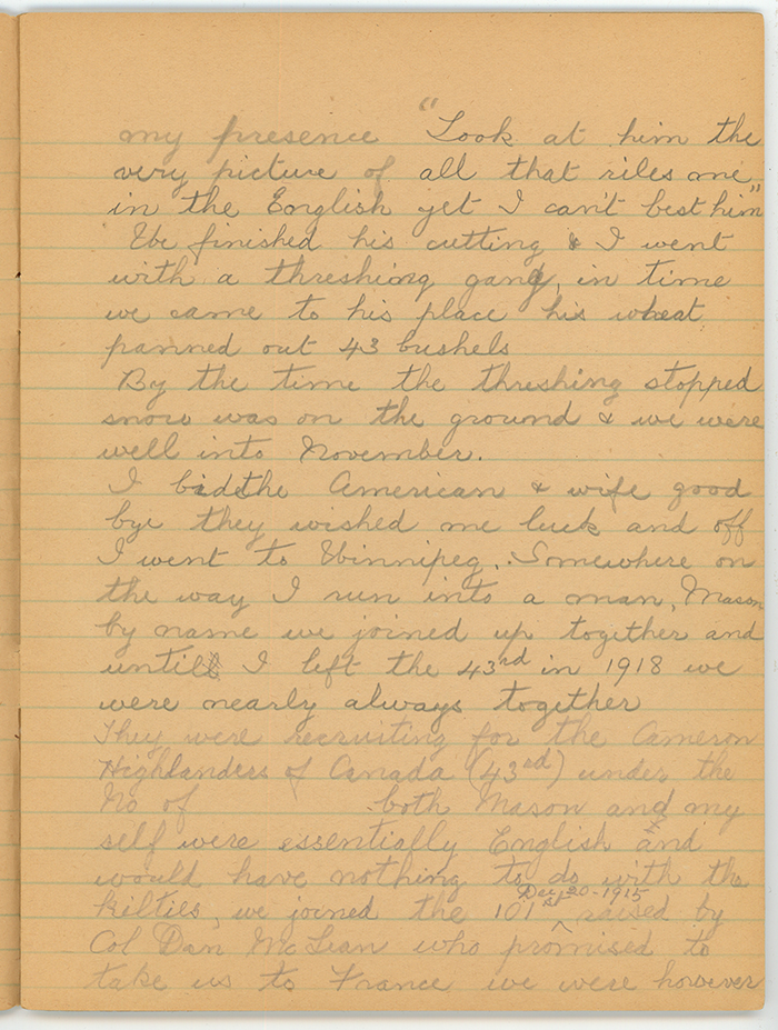 They were recruiting for the Cameron Highlanders of Canada (43rd) under the No of________ both Mason and myself were essentially English and would have nothing to do with the kilties. We joined the 101st, December 20-1915 raised by Col. Dan McLean who promised to take us to France we were however fated to be drafted to that same 43rd Batt. we were sore at being sent to a kiltie battalion but had to get over it.