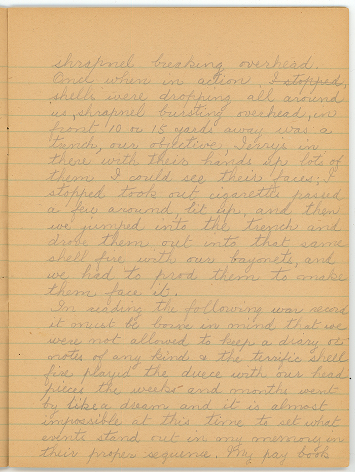 I had nerves of steel, I knew fear but I had a will power that would force my body to walk up to death itself. It was said to be sure death to take the third light off a match. I have often done it with shrapnel breaking overhead.  Once when in action, shells were dropping all around us, shrapnel bursting overhead, in front 10 or 15 yards away was a trench, our objective, Jerrys in there with their hands up lots of  them. I could see their faces; I stopped took out cigarettes passed a few around lit up, and then we jumped into the trench and drove them out into that same shellfire with our bayonets, and we had to prod them to make them face it.