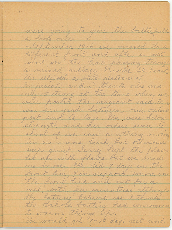 September 1916 we moved to a different front and after a rest went in the line passing through a ruined village Nuvelle St. Vaast. We relieved a full platoon of Imperials and I think ours was only 15 strong at the time when we were posted the sergeant said there was 200 yards between our outside post and A Coys. We were below strength and our orders were to shoot if we saw anything moving in no man's land, but otherwise keep quiet. Jerry kept the place lit up with flares but we made no move. We did 7 days in the front line, 7 in support, 7 more in the front line and out for a rest, with few casualties although the battery behind us I think the Lahore battery had commenced to warm things up.