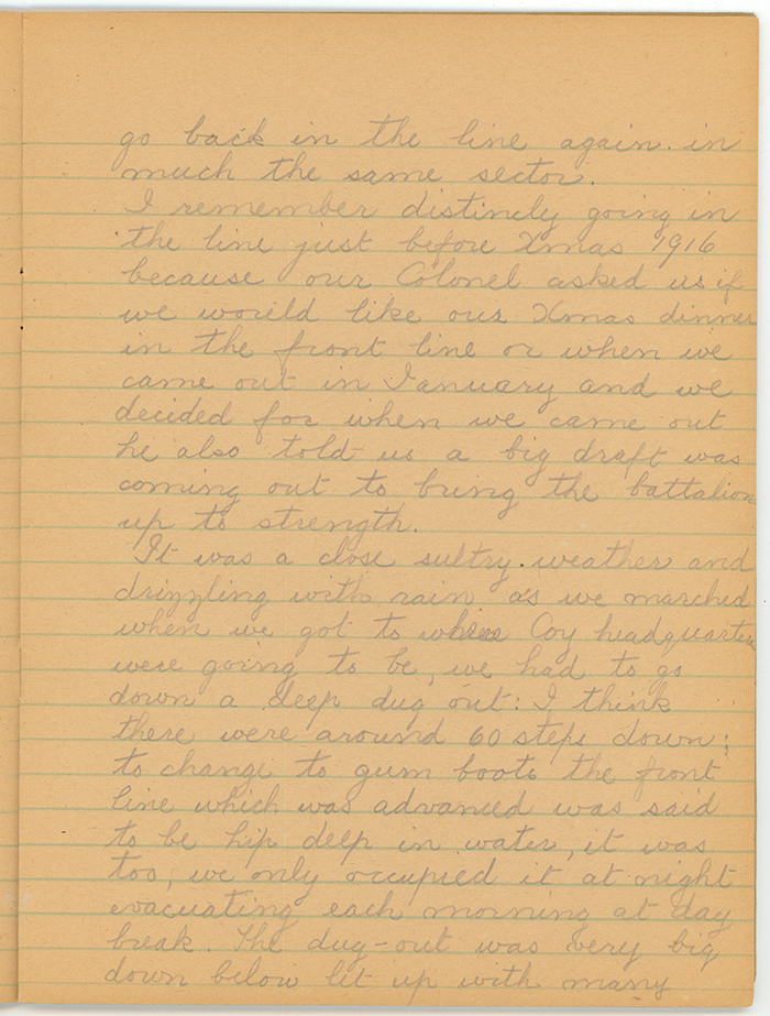 I remember distincly going in the line just before Xmas 1916 because our Colonel asked us if we would like our Xmas dinner in the front line or when we came out in January and we decided for when we came out he also told us a big draft was corning out to bring the battalion up to strength.