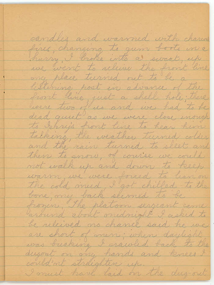 It was a close sultry weather and drizzling with rain as we marched when we got to where Coy headquarters were going to be, we had to go down a deep dug out: I think there were around 60 steps down; to change to gum boots the front line which was advanced was said to be hip deep in water, it was too, we only occupied it at night, evacuating each morning at day break. The dug-out was very big down below lit up with many candles and warmed with charcoal fires, changing to gum boots in a hurry, I broke into a sweat, up we went to relieve the front line my place turned out to be a listening post in advance of the front line, just a shell hole; there were two of us and we had to be dead quiet as we were close enough to Jerry's front line to hear him talking, the weather turned colder and the rain turned to sleet and then to snow, of course we could not walk up and down to keep warm, we were forced to lean on the cold mud, I got chilled to the bone, my back seemed to be frozen. The platoon sergeant came around about midnight I asked to be relieved no chance said he, we are short of men; when daylight was breaking I crawled back to the dugout on my hands and knees I could'nt straighten up.