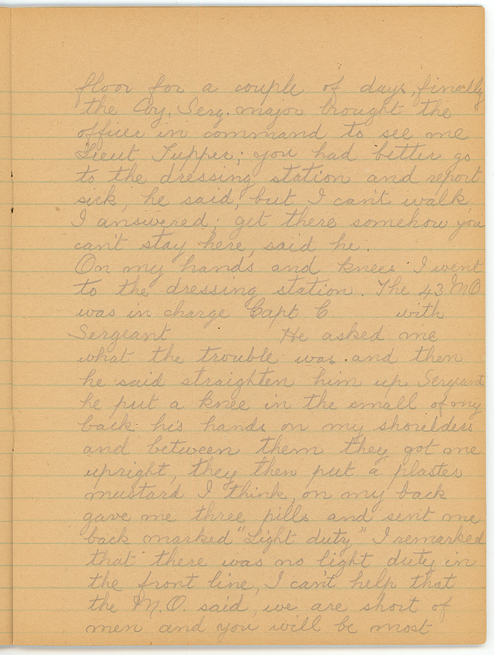 I must have laid on the dug-out floor for a couple of days, finally the Coy. Serg. major brought the officer in command to see me, Lieut. Tupper; you had better go to the dressing station and report sick, he said, but I can't walk I answered; get there somehow you can't stay here, said he.