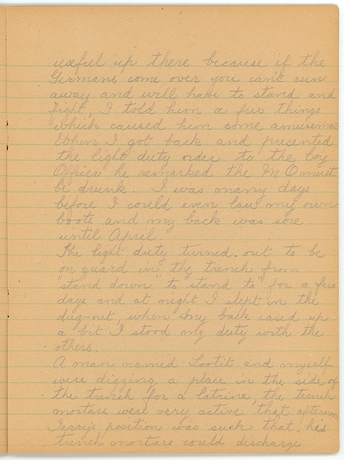 The light duty turned out to be on guard in the trench from "stand down" to "stand to" for a few days and at night I slept in the dug-out, when my back eased up a bit I stood my duty with the others.