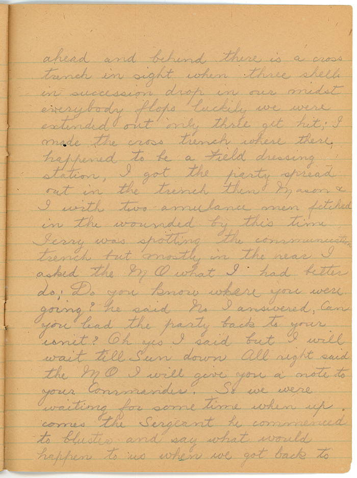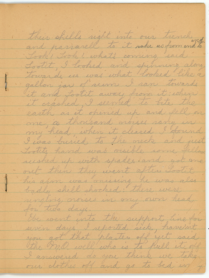 A man named Lootit [?] and myself were digging a place in the side of the trench for a latrine, the trench mortars were very active that afternoon. Jerry's position was such that his trench mortars could discharge their shells right into our trench and parrarell to it rake us from end to end. Look! Look! what's coming said Lootit. I looked and spinning along towards us was what looked like a gallon jar of rum, I ran towards it and Lootit away from it: when it crashed, I seemed to bite the earth as it opened up and fell on me, a thousand noises rang in my head, when it cleared I found I was buried to the neck and just Lootit's hand was visible some fellows rushed up with spades and got me out then they went after Lootit his arm was missing he was also badly shell shocked: there were ringing noises in my own head for two days.
