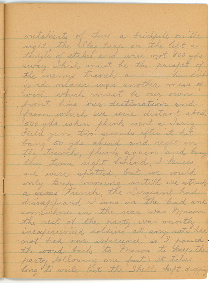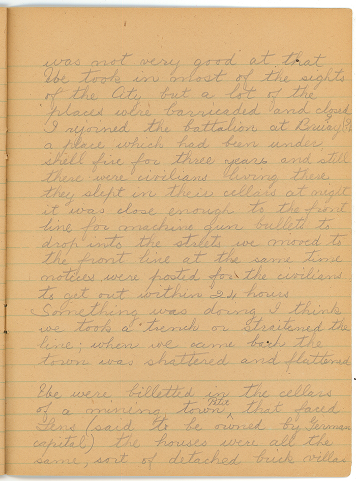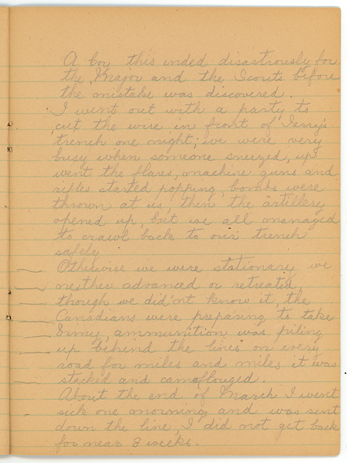 All Sunday night I tossed and fought part of Monday and the night again all Tuesday though I went to work I was on the Battle Front, that night I slept, I woke early refreshed but my thoughts shot back to the War Zone, all day Wednesday, my wife would speak to me or the boys, yes I would say, getting no other answer they would speak again with an effort I would come back, my thoghts were miles away. Back to France I would go again. I slept a little and woke around 2am, back went my mind to France. Thursday I worked while my mind followed the war and tonight I am starting to write what I can remember the boys will be glad to read it when they grow up perhaps.