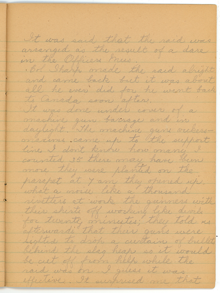 It was done under cover of a machine gun barrage and in daylight. The machine guns vickers-maxims came up to the support line I don't know how many. I counted 35 there may have been more they were planted on the parapet at 7 am they opened up what a noise like a thousand rivetters at work the gunners with their shirts off working like devils for twenty minutes; they told us afterwards that their guns were sighted to drop a curtain of bullets behind the slag heap so it would be cut off from help while the raid was on. I guess it was effective. It surprised me that no shells were dropped in the machine-gun trench while the raid was on, we all were moved out pretty quick after it was over the gunners went out but we had to stay in support we got shelled steady for some three days and had some casualties too.