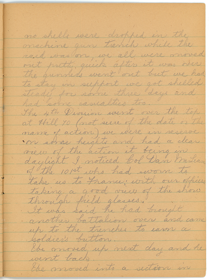 The 4th Division went over the top at Hill 70 (not sure of the date or the name of action) we were in reserve on some heights and had a clear view of the action it being in daylight. I noticed Col Dan McLean of the 101st who had sworn to take us to France; with our officers taking a good view of the show through field glasses.