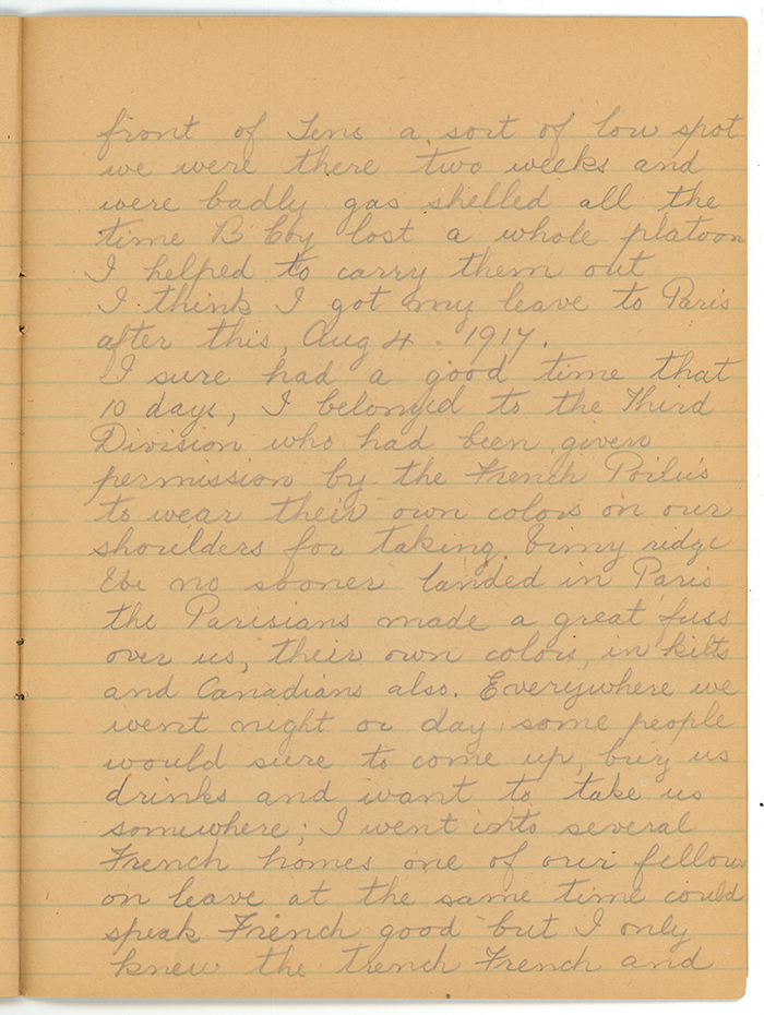 We moved into a section in front of Lens a sort of low spot we were there two weeks and were badly gas shelled all the time. B Coy lost a whole platoon. I helped to carry them out. I think I got my leave to Paris after this, Aug 4, 1917.