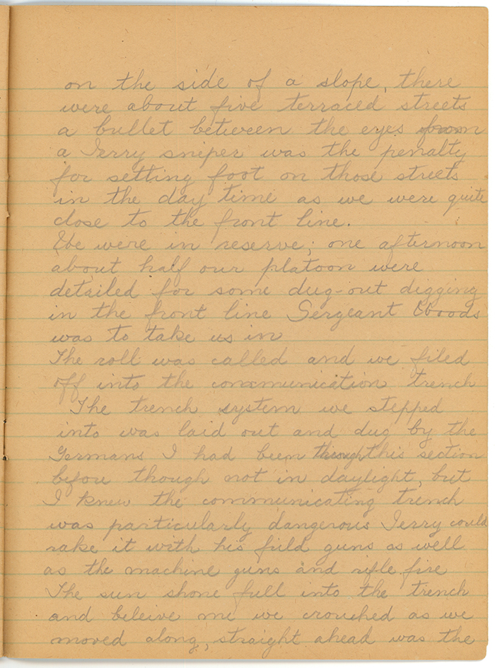 We were in reserve; one afternoon about half our platoon were detailed for some dug-out digging in the front line. Sergeant Woods was to take us in.
