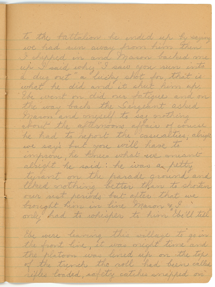what I had better do; Do you know where you were going he said. No I answered, Can you lead the party back to your unit? Oh yes I said but I will wait till Sun down. All right said the M.O. I will give you a note to your Commander. So we were waiting for some time when up comes the Sergeant. He commenced to bluster and say what would happen to us when we got back to the battalion he ended up by saying we had run away from him then I chipped in and Mason backed me up I said why "I saw you run into a dug-out" a lucky shot for, that is what he did and it shut him up.  We went on did our fatigue and on the way back the Sergeant asked Mason and myself to say nothing about the afternoons affair of course he had to report the casualties; alright we say's but you will have to improve, he knew what we meant alright he said: he was a petty tyrant on the parade ground and liked nothing better than to shorten our rest periods but after that we brought him in line Mason and I only had to whisper to him "We'll tell".